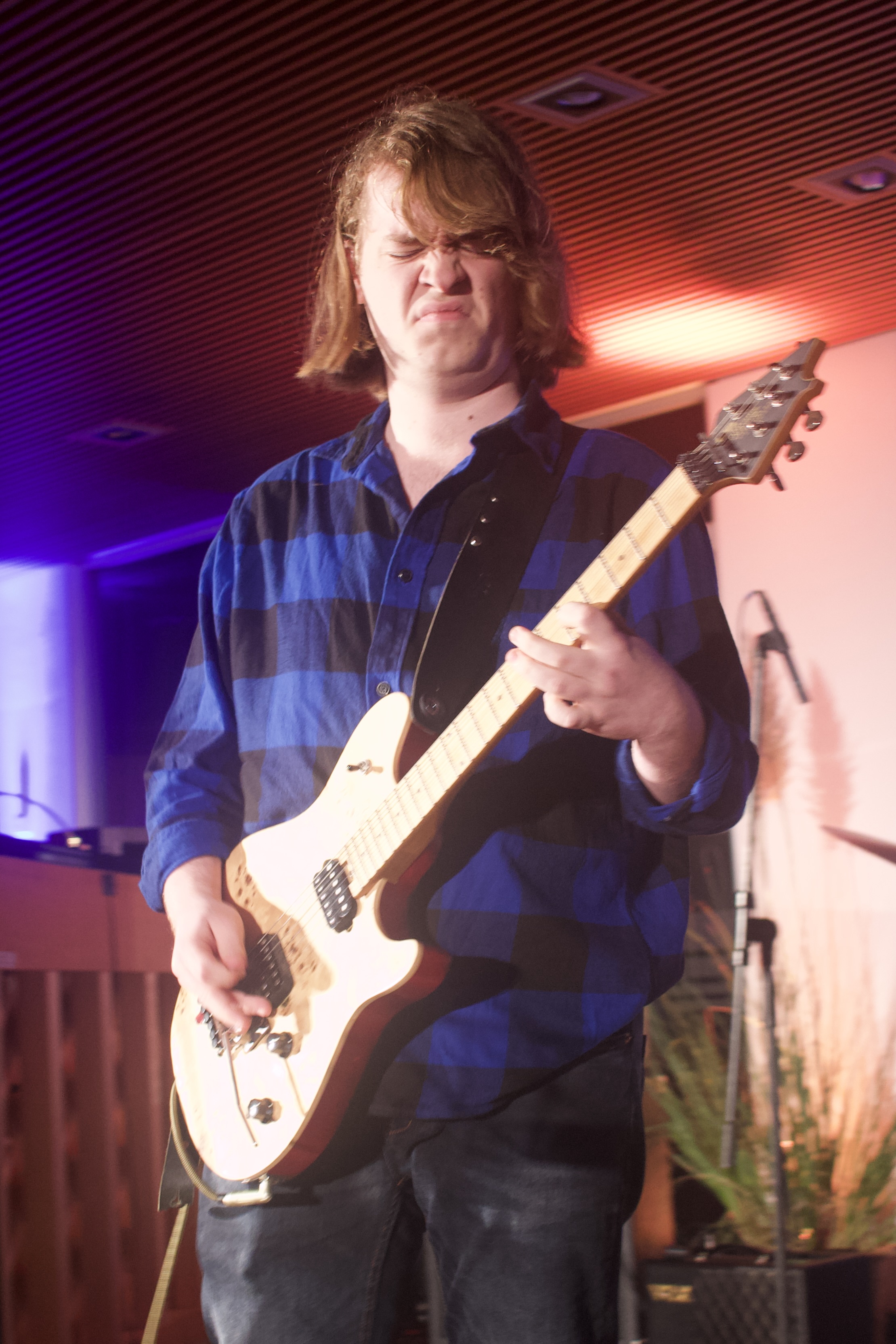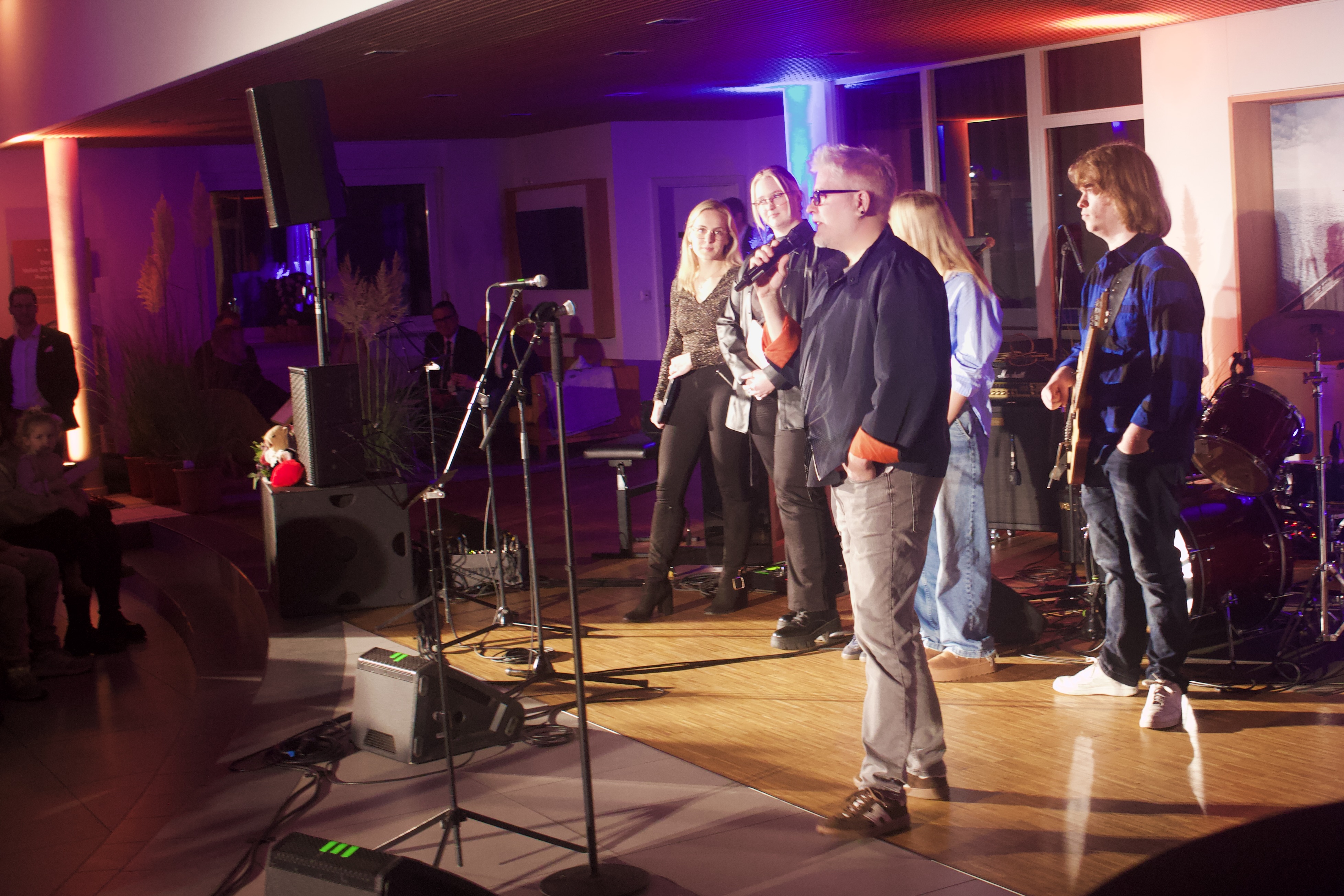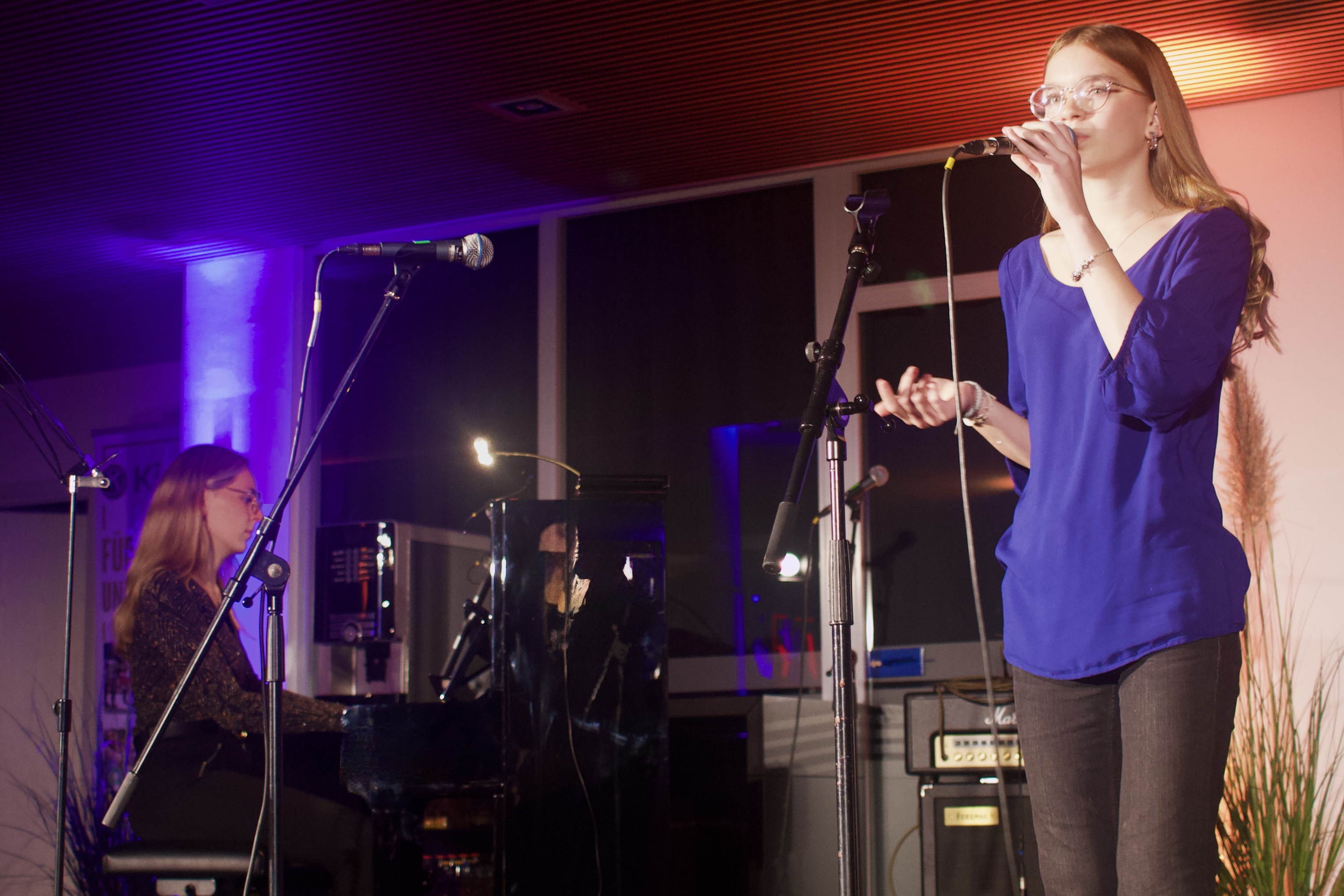 Hannah Lobeck (Gesang - 9.Klasse), Lea Stahmer (Gesang - 8.Klasse), Eric Thun (E-Gitarre - 11.Klasse) und Nicholas Rock (E-Bass - 10. Klasse) überzeugten dabei mit charismatischer Bühnenpräsenz und musikalischem Können. Das poppig-rockige Programm, mit Titeln wie z.B. „Shallow“ (Lady Gaga), „Sucker In A 3 Piece“ (Van Halen) und „Saturn“ (SZA), kam bei dem Publikum ausgesprochen gut an - tosender Beifall schon nach dem ersten Beitrag des Abends.